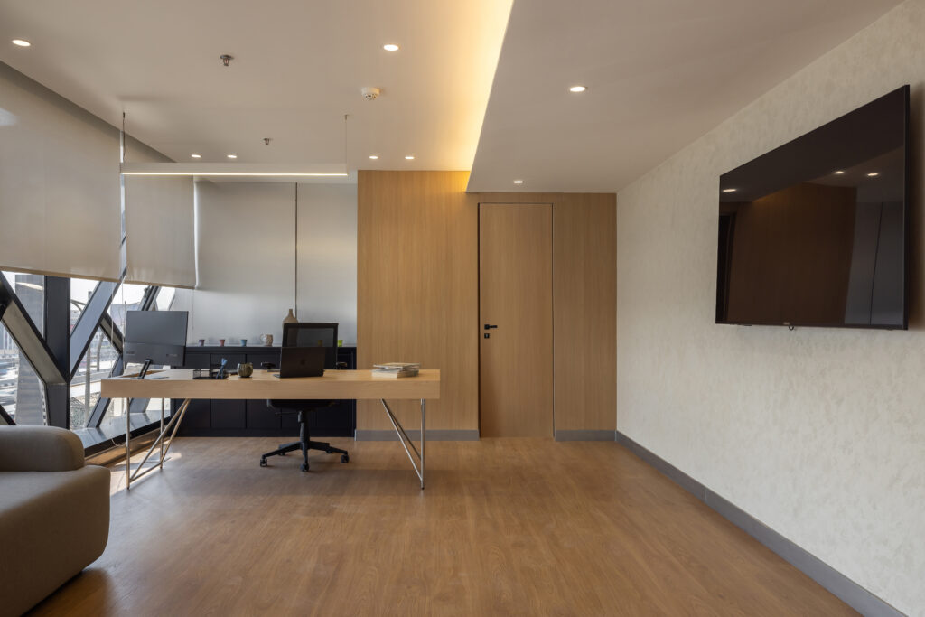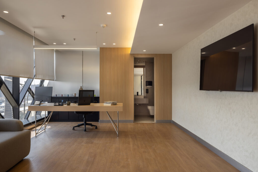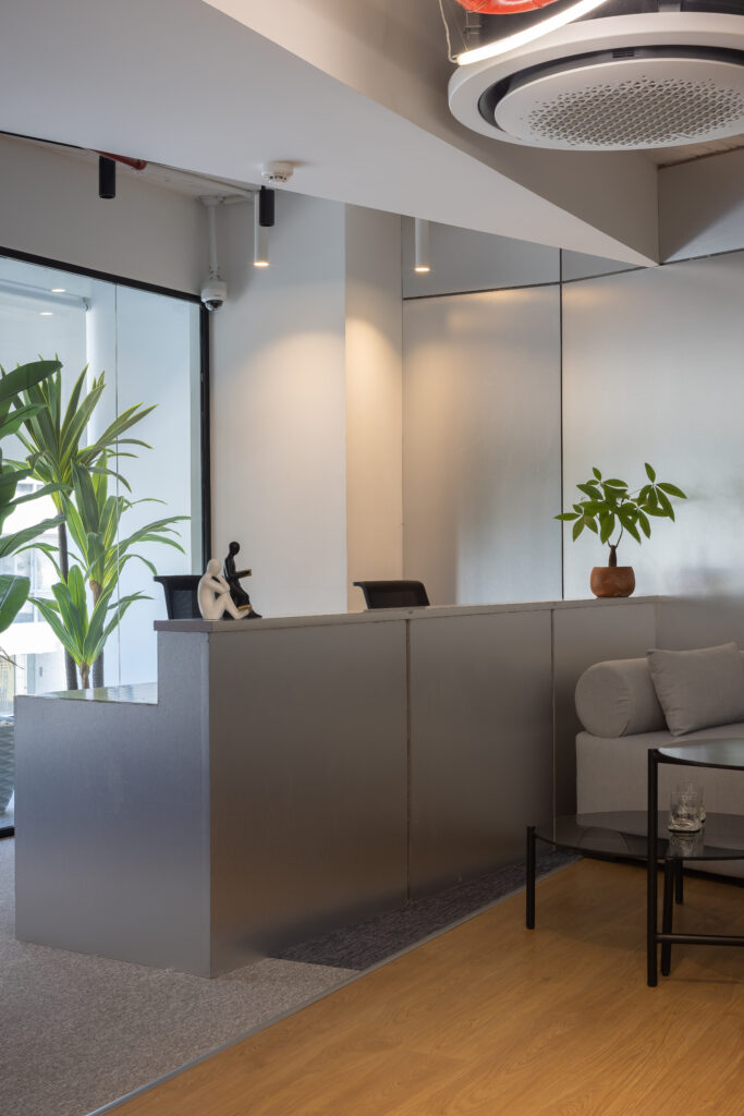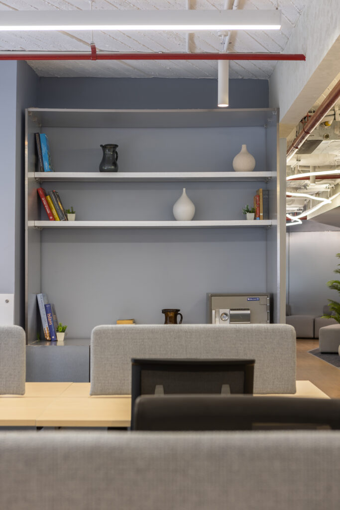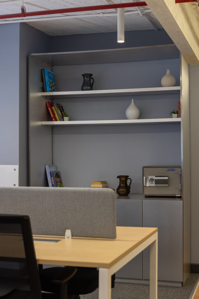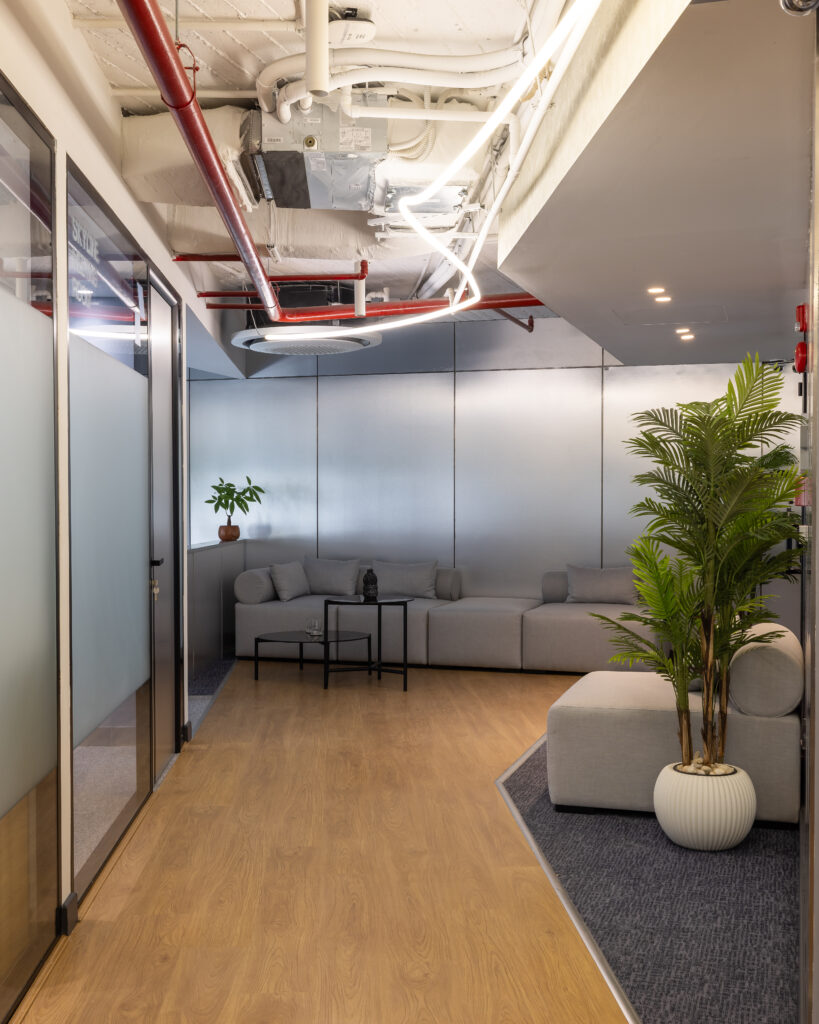 At the center of the office, a custom lounge area anchors the environment. With tailored seating, integrated benches, and subtle branding, it strikes the balance between professionalism and comfort. This thoughtful spatial design supports team productivity, corporate culture, and seamless client interaction.