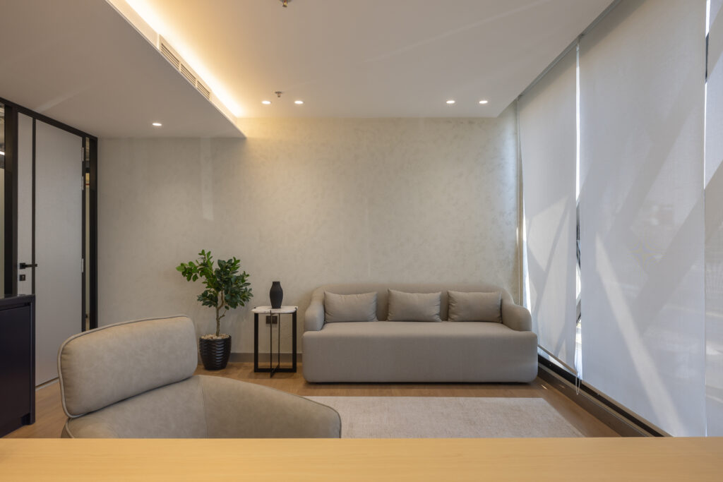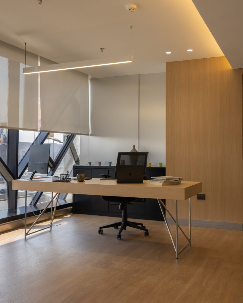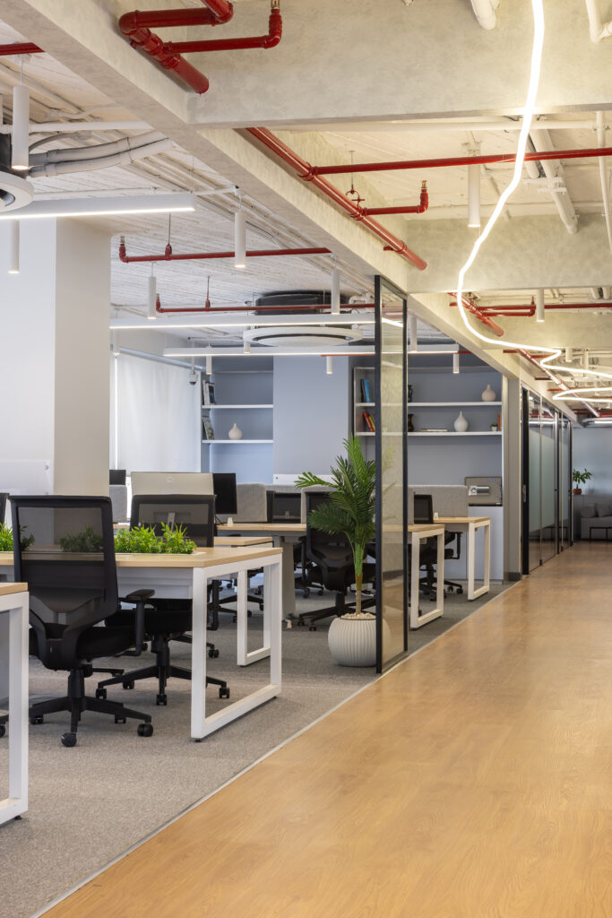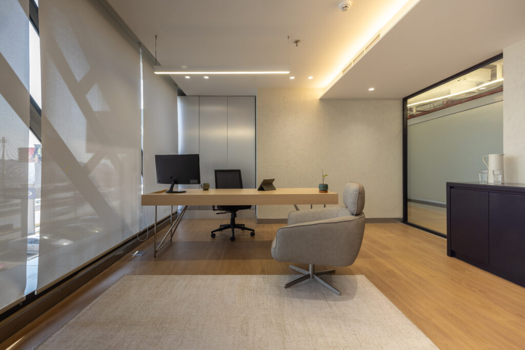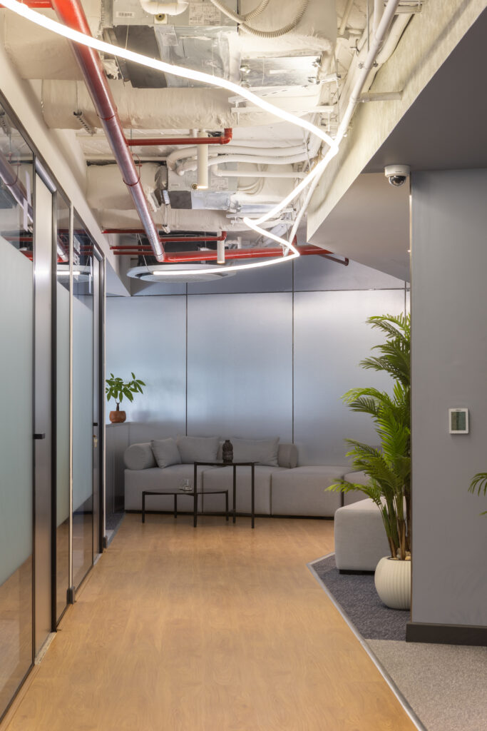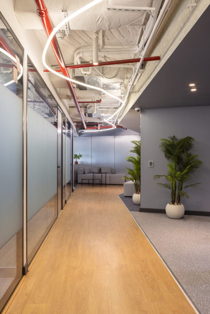 At the center of the office, a custom lounge area anchors the environment. With tailored seating, integrated benches, and subtle branding, it strikes the balance between professionalism and comfort. This thoughtful spatial design supports team productivity, corporate culture, and seamless client interaction.