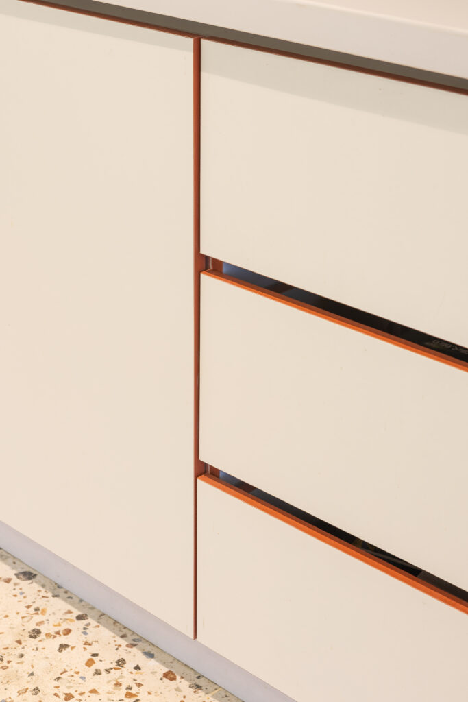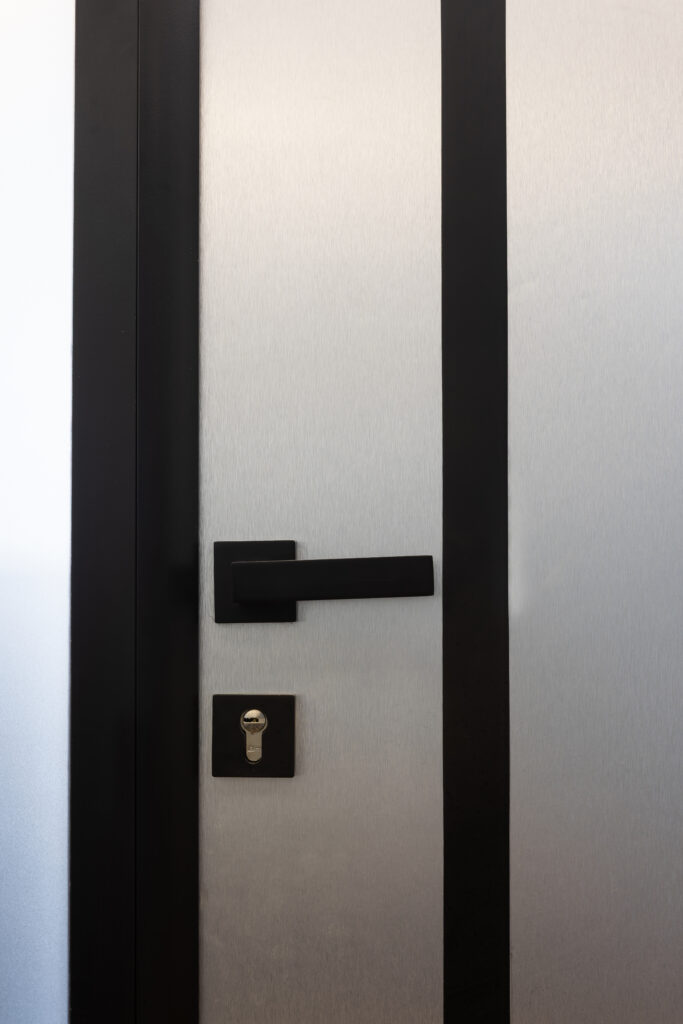 The textured concrete-painted walls establish a bold, modern backdrop, softened by the warmth of parquet-patterned HDF flooring. Each metal-reinforced door opens with a weight that speaks to durability and precision, echoing the craftsmanship invested in the execution.